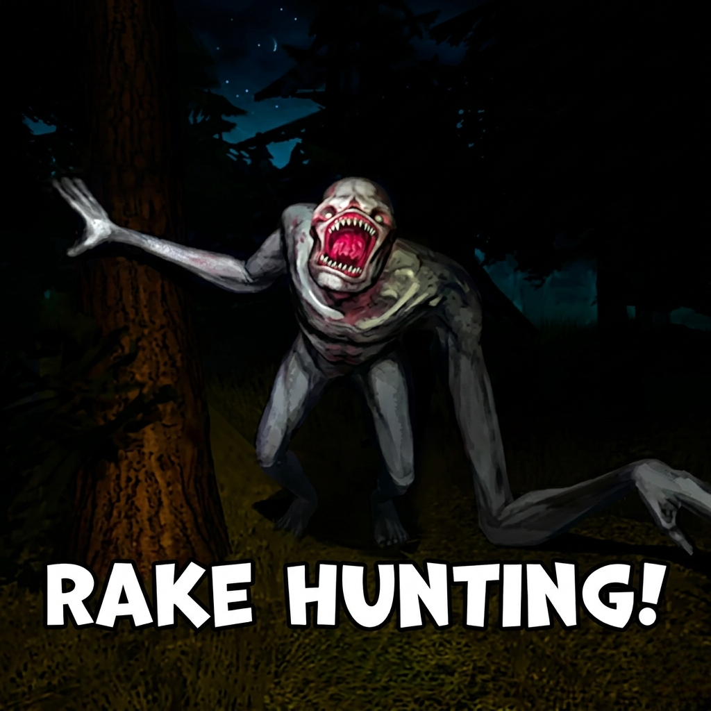 In Rake Hunting!, the hunt begins in a remote forest where disappearances hide a far more terrifying truth beneath the silence. The story places you in a remote forest where people vanish without explanation, and those found carry unnatural wounds. You take on the role of a hunter armed with a rifle, a flashlight, and bait, stepping into a place where silence hides danger. The creature you seek is not mindless, as it observes, adapts, and waits for the right moment to strike from unseen angles.